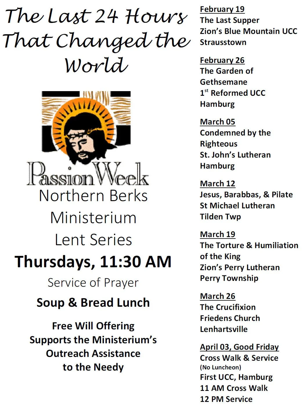 For the six Thursdays of Lent, churches within the Northern Berks Ministerium will be taking turns hosting a mid-week afternoon community worship service followed by a soup & bread luncheon. Our theme this year is “The Last 24 Hours That Changed the World.“ We hope you will join us as we grow in faith and grow in supportive fellowship with one another.