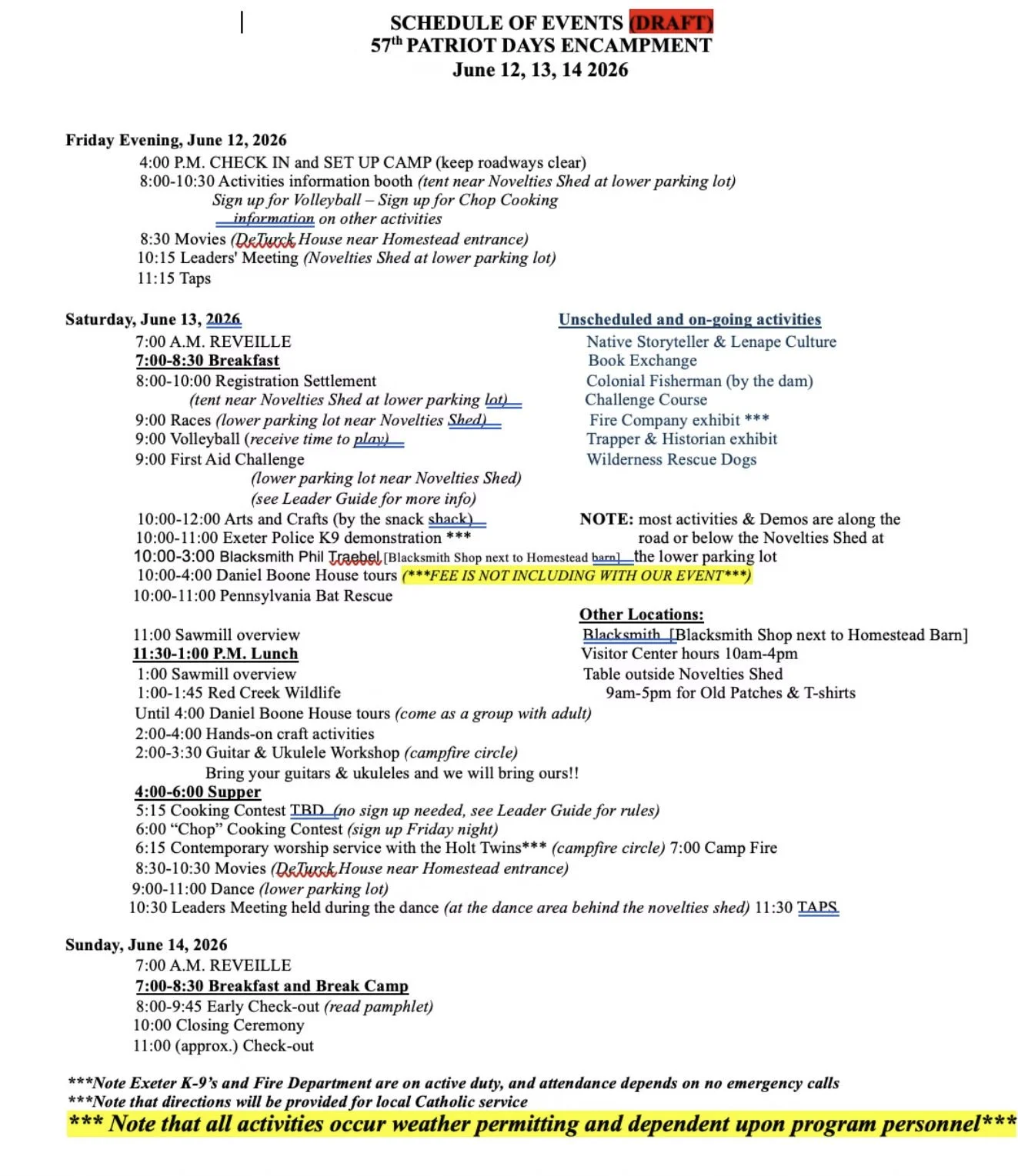 Our Youth Group, along with many other youth organizations, will be participating in the annual Patriot Days Encampment at the Daniel Boone Homestead.